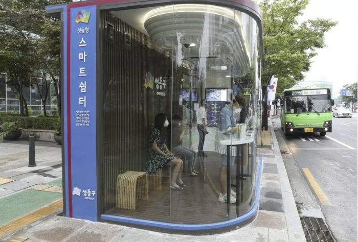 韓國使用高科技的公共汽車候車室防止Covid-19的傳播。 這10個 “智能候車亭 “配備了用于檢查溫度的外部熱像儀和內(nèi)部的紫外線消毒燈。 沿著首都首爾市城東區(qū)的主要公交路線設(shè)置了太陽能發(fā)電的候車室。 乘客必須站在自動熱像攝影機的前面,只有在檢測到溫度低于99.5F時,滑動門才會打開。 下面還設(shè)置了另一個檢測兒童的攝像頭。排污泵